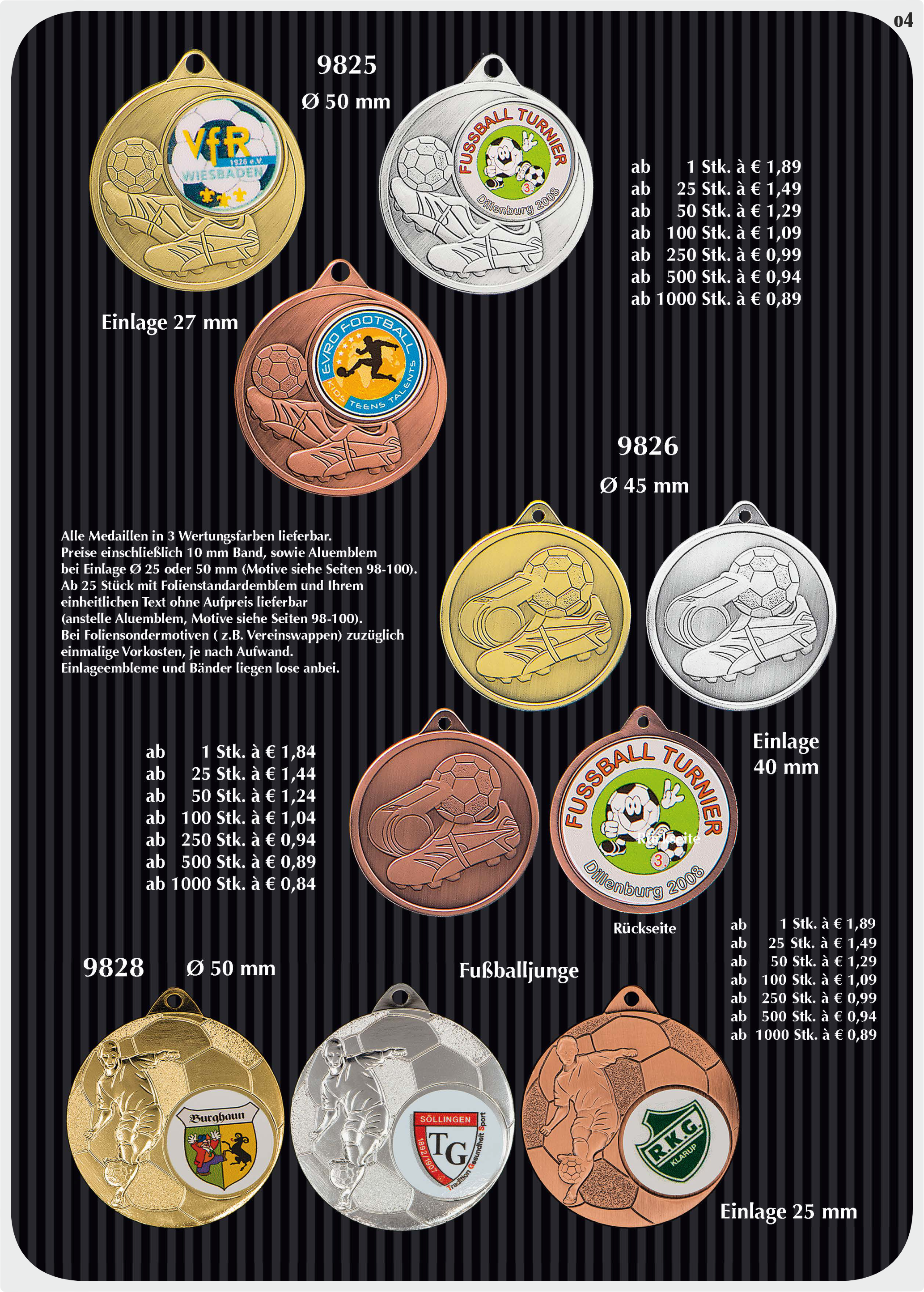 Alle *Fußballmedaillen* bieten wir Ihnen als Mengenpreise ( (Mindestbestellmenge 25 Stück pro Artikelnummer - Wertungsfarben können untereinander gemischt werden) zu besonders günstigen Staffelpreisen an.